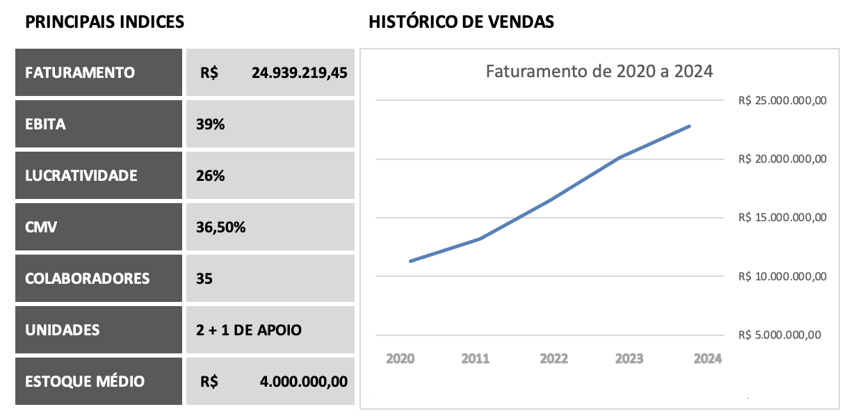 Como se pode observar pelo quadro resumo acima, a empresa tem resultados absolutamente expressivos, com EBITDA e Lucro muito elevados e um CMV justo, em linha com uma gestão que não compra e não vende nenhum produto sem nota fiscal. É importante notar também a impressionante curva de crescimento de 20% ao ano nas vendas de 2018 pra cá, quando faturava abaixo de dois dígitos. Esses dados foram obtidos tanto através de relatórios contábeis como gerenciais de sistema.